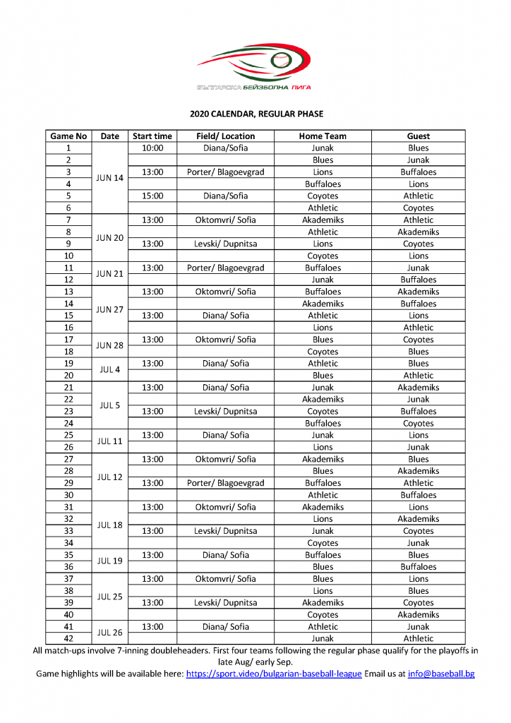 The Bulgarian government has lifted restrictions on all outdoor sports activities as of June 10 and the Bulgarian Baseball League will therefore begin on June 14. Seven clubs have confirmed their participation in a 42-game regular phase. The best four following the regular phase will battle in the playoffs in the fall. On Saturday June 13, we will observe a great day of activities for kids and young lovers of baseball and softball with all clubs sending their respective teams, while from Sunday, June 14 and onward – it’s the men’s baseball teams to take center stage with the games from the league.