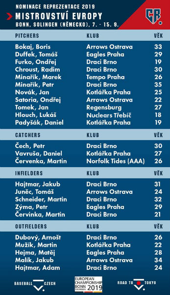 The Czech Baseball Association released its final roster for the 2019 European Baseball Championship in Bonn and Solingen, Germany on Thursday. Mike Griffin and his coaching staff nominated 24 players for the tournament, which will be played from September 7 to 15.