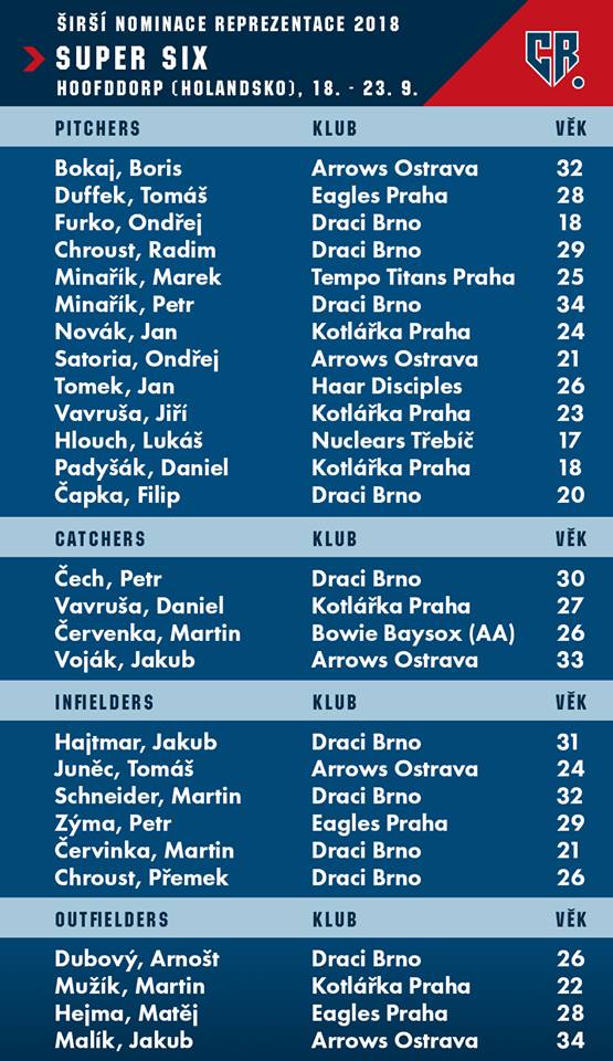 The Czech Baseball Association (CBA) announced its roster for the inaugural Super6 tournament, which will be played in Hoofddorp in September. The coaching staff will be led by Mike Griffin, supported by Michal Müller, Petr Baroch, Hynek Capka and Corey Lee. Also on the roster is Double-A catcher Martin Cervenka of the Baltimore Orioles.