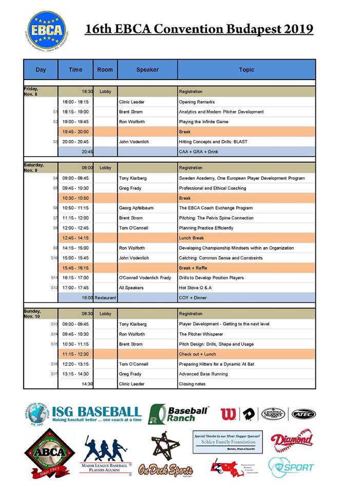 The European Baseball Coaches Association (EBCA) released the program for the 2019 EBCA Convention, which will be held from November 8 to 10 in Budapest, Hungary. For more information about the EBCA Convention visit www.baseball-in-europe.com.