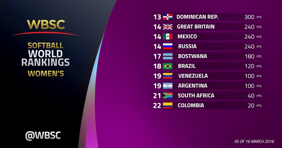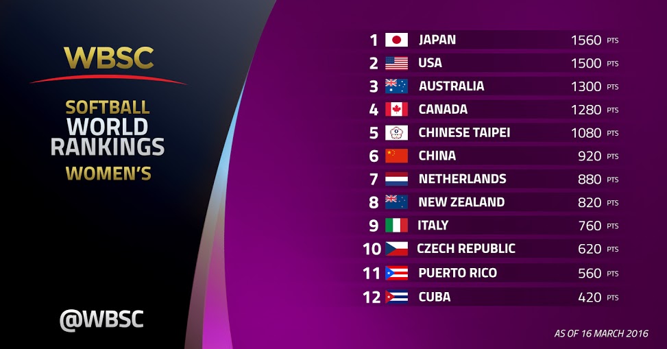 “These new softball world rankings mark another major milestone in the history of our global sport,” said WBSC Softball Division President Dale McMann. “These rankings not only provide a benchmarking tool for nations to construct and evaluate their strategic/development plans, but they also give the players and fans a new and exciting way to express the pride of their country through sport.”
